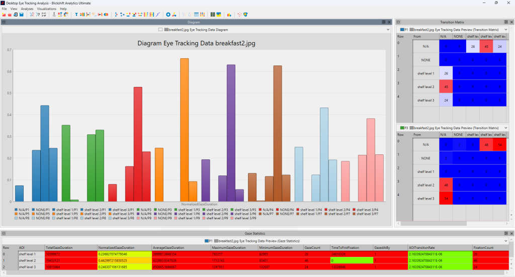 - We’ve analyzed what metrics most eye tracking researchers are using and have implemented all of them in one single component! With Blickshift Analytics you can now compute up to 21 metrics without any implementation of code just by a mouse-click. Like computing these metrics is easy, you can simply export all these metrics in standard csv format for a further statistical analysis with the tools you are currently already using. If you want to directly visualize the statistical results this is also possible. The statistic node seemlesly works together with our diagram component. Both components are available in all edition of Blickshift Analytics together with the data exporter.