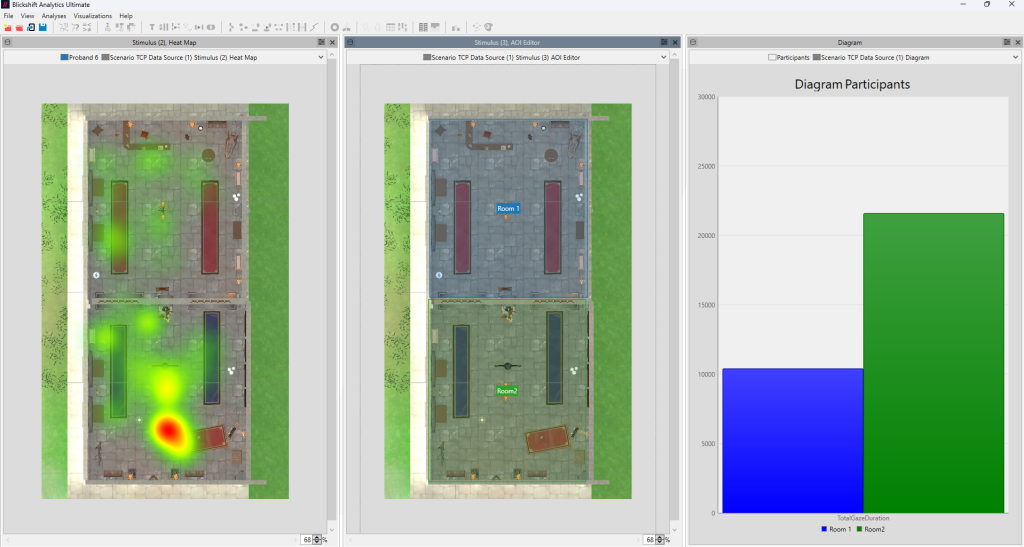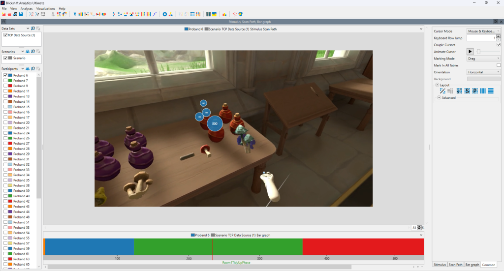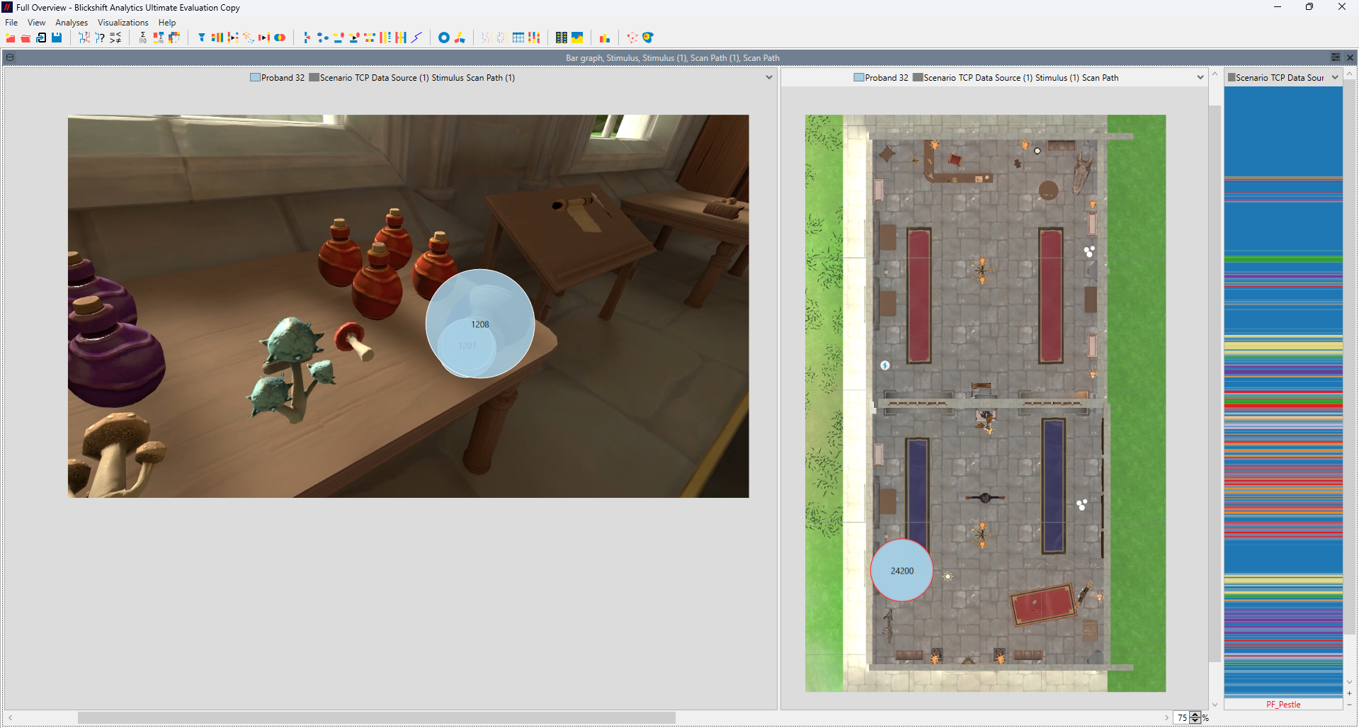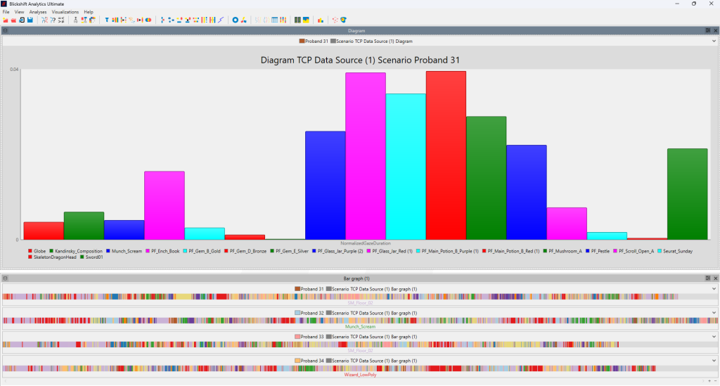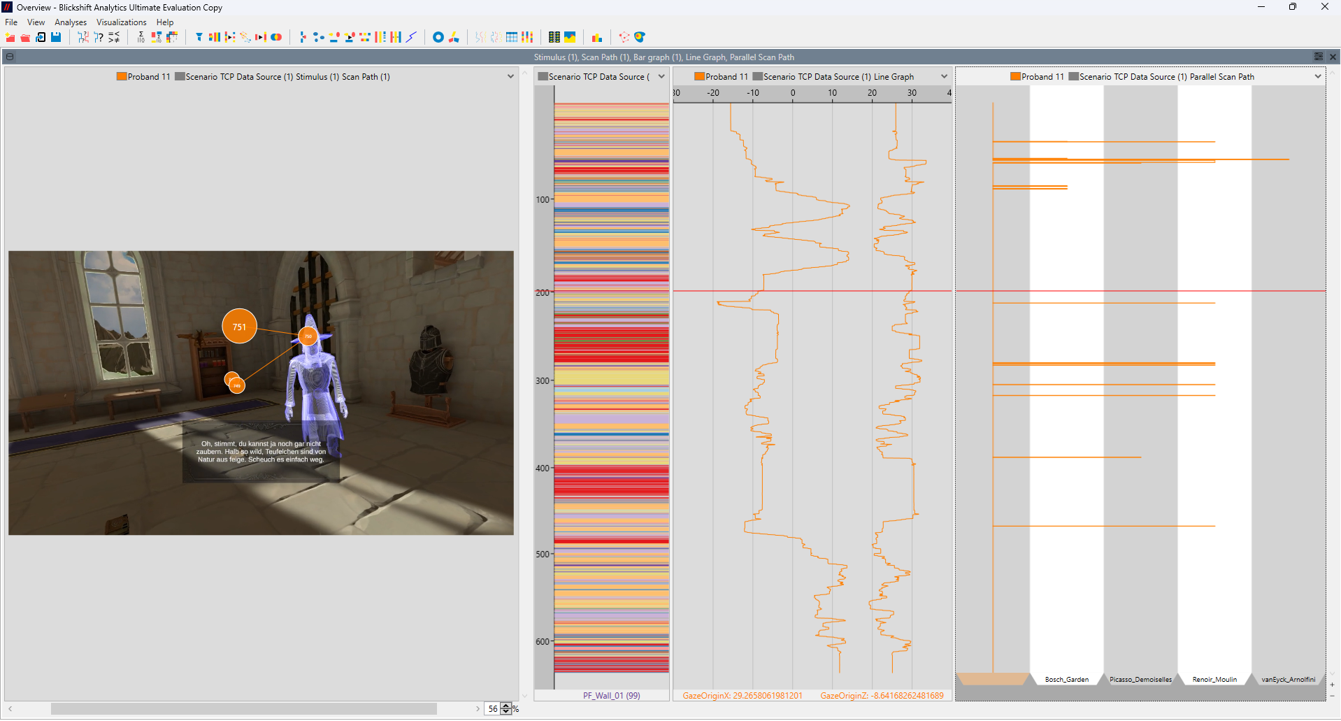 - Imagine gaining a detailed overview of user behavior in a 3D environment with just four mouse clicks. By combining a scan path visualization with a dynamic bar graph, Blickshift Analytics delivers an interactive replay that shows both the overall situation and the user’s ego perspective, complete with precise eye-movement data. This provides researchers with an intuitive and comprehensive understanding of how users explore and perceive immersive virtual worlds.