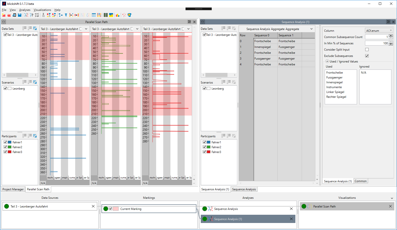 Consider the following example: Figure 1 shows a sequence analysis that analyzes the region marked in the parallel scan path on the left. As it does not consider the split input, two lengthy sequences are found that occur in the data of all participants. Figure 2 shows what happens when it is required that a sequence occurs in every section of the input: Only one short sequence can be found in all marked section. The section marked in the lower half of the blue participant gives an immediate indication of why no longer sequence could be found.