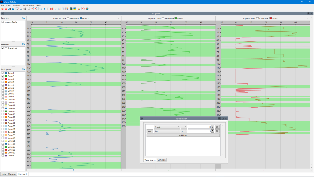 Allows adapting selections and search results in a time-dependent manner (e.g. “all data 5 seconds before the driver crossed the 100km/h threshold”).